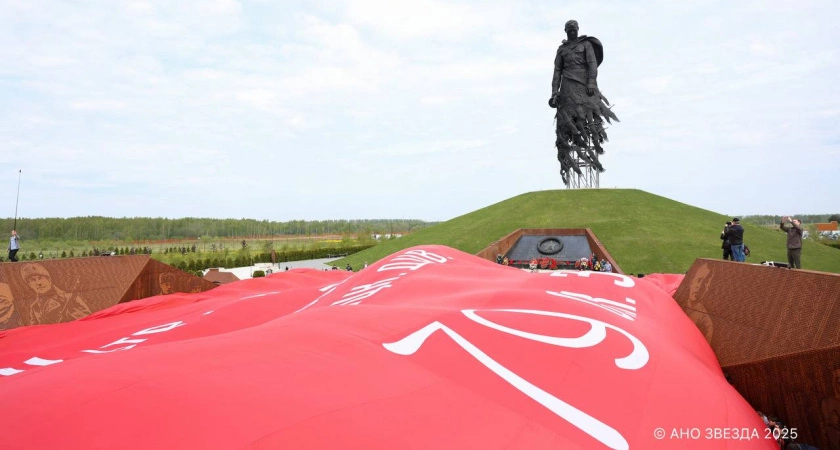 Самую большую в мире копию Знамени Победы развернули у мемориала во Ржеве