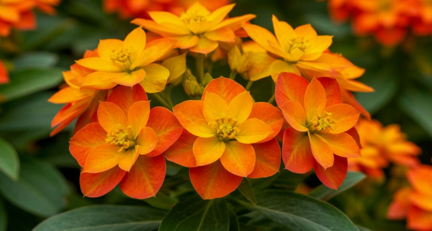 Эуфорбия «Bonfire» В апреле-мае куст пылает пламенно-оранжевыми и алыми листами. Под конец весны вы можете увидеть в своем саду иллюзию живого костра. Осенью листики приобретают великолепные пурпурные, бордовые и бронзовые тона. Цвести эуфорбия может до самого мороза.