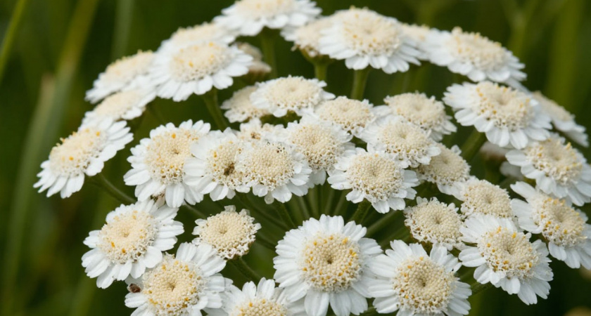 Но главное украшение этого тысячелистника – его соцветия. С июля по октябрь, а иногда и до первых заморозков, над зеленью возвышаются многочисленные цветоносы. Их белоснежные, почти перламутровые бутоны напоминают россыпь жемчужин или миниатюрные снежные шарики. Особенно эффектно они смотрятся в полутени или на фоне темной листвы кустарников.
