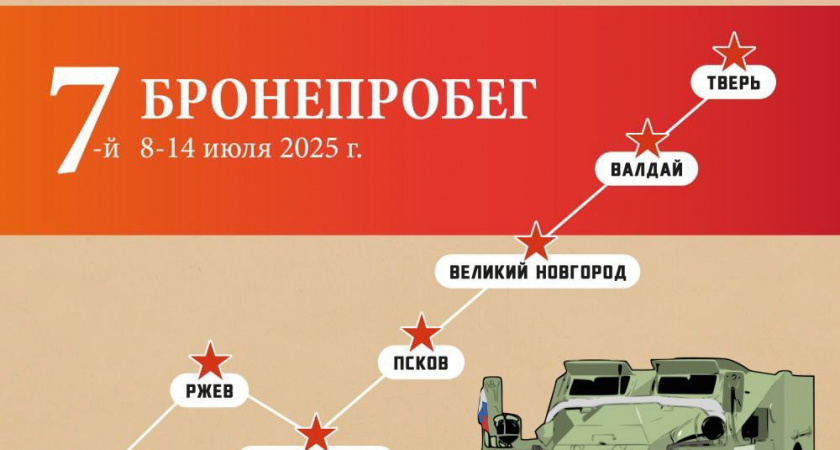 9 июля участники бронепробега «Дорога Мужества» посетят Ржев для возложения цветов к Мемориалу Советскому солдату. Колонна восстановленной бронетехники периода Великой Отечественной войны (14 единиц) выдвинется из Москвы 8 июля.