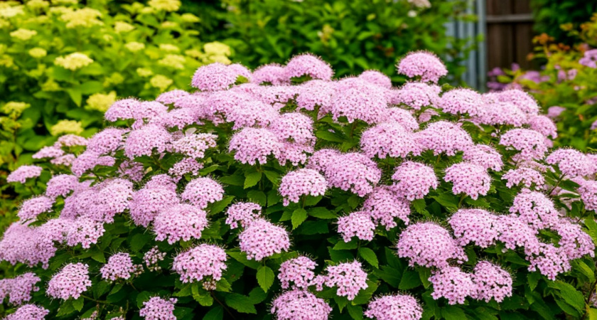 Спирея прекрасно сочетается с другими растениями: