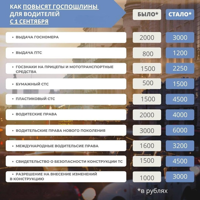 Закон точно фиксирует увеличение цены за получение госномеров – теперь это будет 3000 рублей, вместо прежних 2000. Трехкратное повышение ждет свидетельство о регистрации автомобиля (СТС): бумажное будет стоить 1500 рублей, а пластиковое – до 4500 рублей. Паспорт транспортного средства (ПТС) ожидает подорожания с 800 до 1200 рублей.
