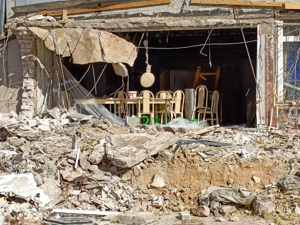 Сейчас на месте примыкания самостроя к зданию зияет пролом. Внутри разрушенной конструкции остались нетронутыми столики и стулья заведения, а прилегающая территория усыпана битым кирпичом и строительными отходами.