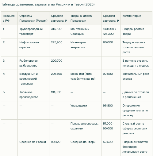Рост зарплат в перечисленных отраслях объясняется сочетанием повышенного спроса на квалифицированные рабочие кадры, дефицитом специалистов и активным развитием строительного, промышленного и сервисного секторов региона. При этом разрыв между федеральными и региональными зарплатами в 2025 году сохраняется, но благодаря высокой динамике в отдельных профессиях Тверь постепенно сокращает отставание от общероссийских показателей.