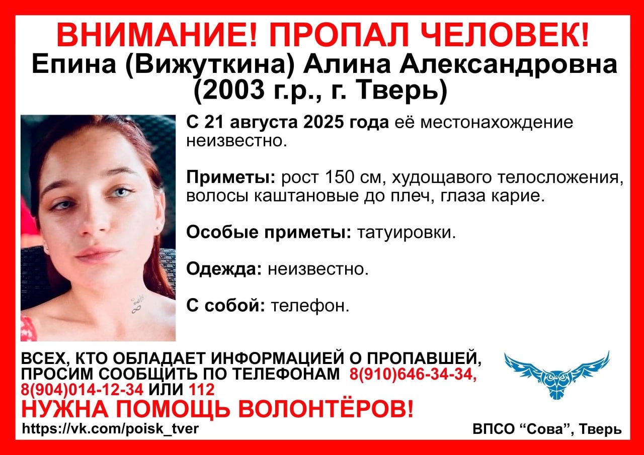 В Твери продолжаются поиски 22-летней Алины Александровны Епиной (Вижуткиной), которая пропала 21 августа 2025 года. Местонахождение девушки остается неизвестным уже более недели. Волонтерский поисково-спасательный отряд «Сова» обратился к общественности за помощью в поисках.