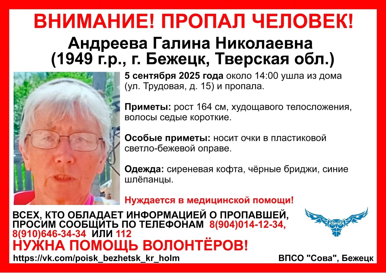В Тверской области продолжаются поиски пропавшей жительницы Бежецка Галины Николаевны Андреевой 1949 года рождения. Пенсионерка вышла из своего дома на улице Трудовой 5 сентября примерно в 14:00 и до настоящего времени не выходила на связь. Волонтеры поисково-спасательного отряда «СОВА» отмечают, что женщина нуждается в медицинской помощи.
