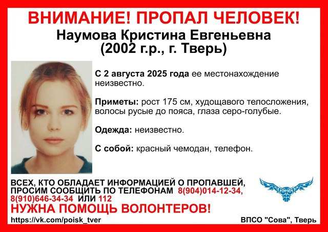 Вот уже более месяца — со 2 августа 2025 года — в Твери разыскивают 23-летнюю Кристину Наумову, которая вышла из дома и не вернулась. Поисково-спасательный отряд «Сова» опубликовал ориентировку и просит помощи жителей города в установлении ее местонахождения.