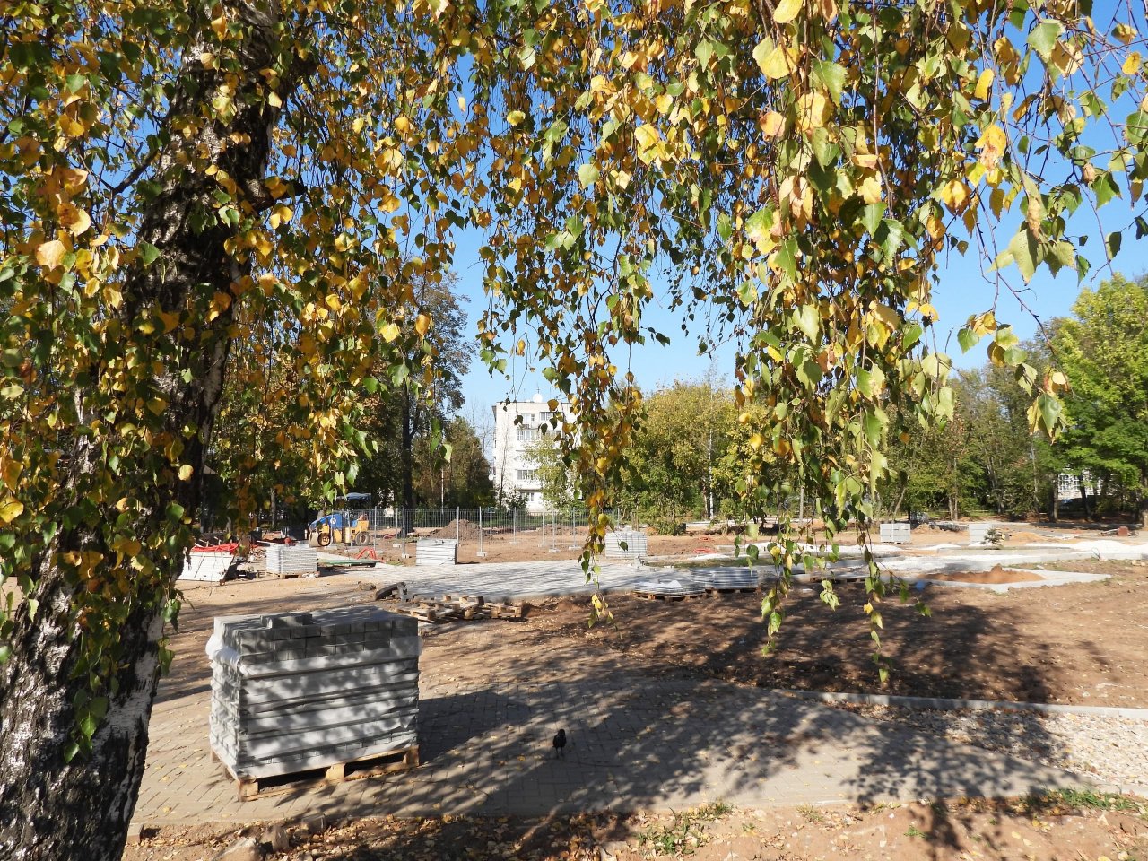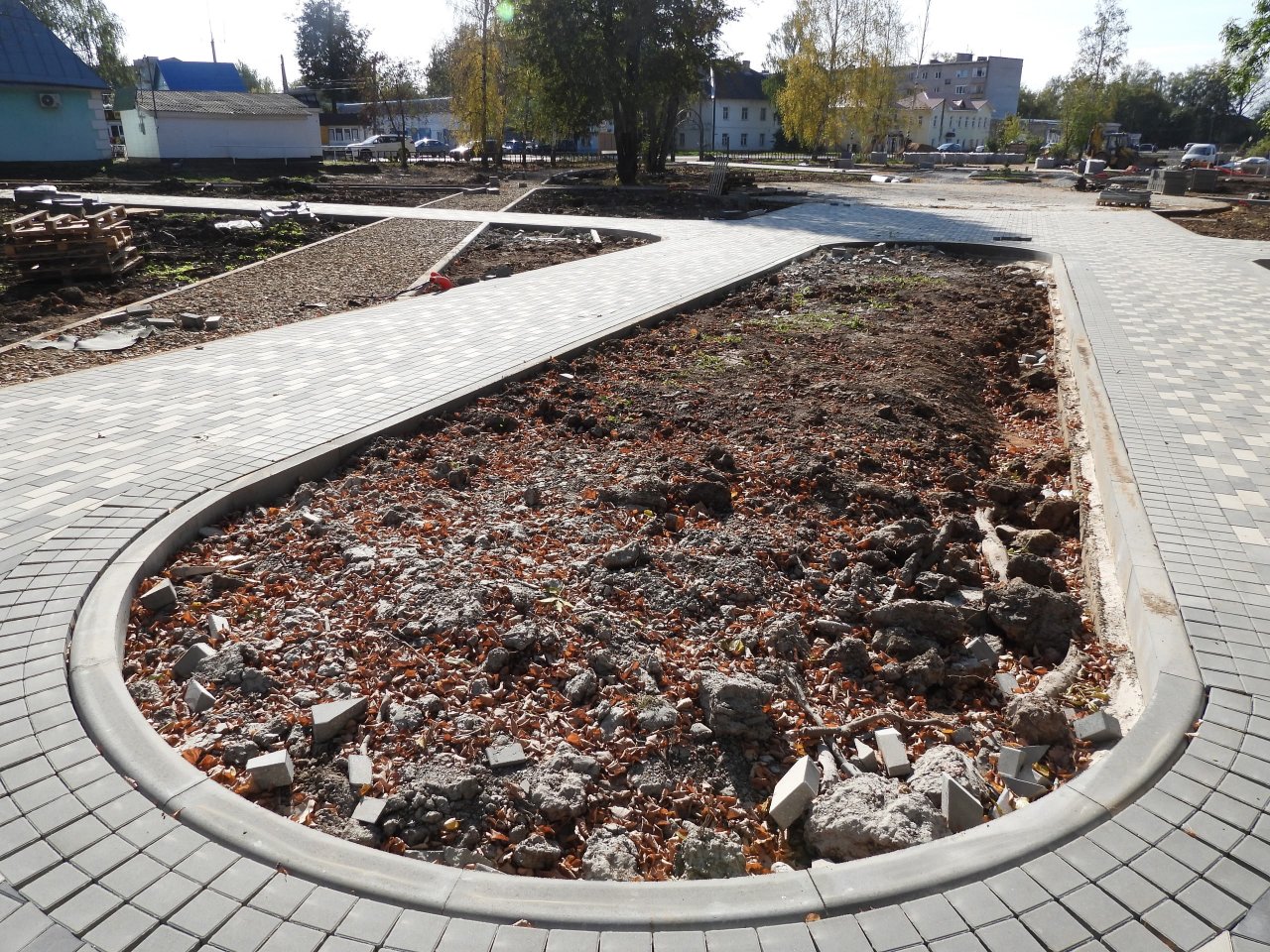 Подготовительный этап работ полностью завершен: выполнена планировка территории, установлены бордюрные камни и проложены все необходимые инженерные коммуникации. Одновременно с мощением дорожек ведется реконструкция сцены для проведения культурно-массовых мероприятий и выступлений.
