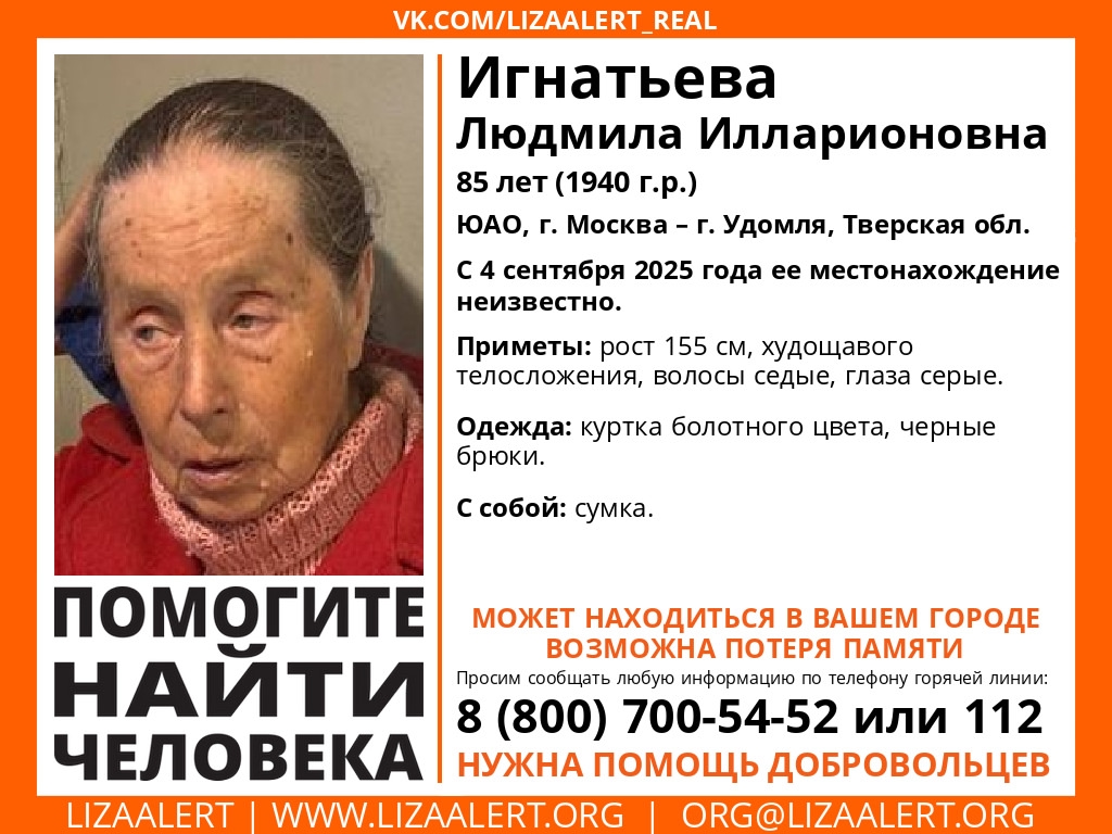С 4 сентября в Тверской области разыскивают 85-летнюю Людмилу Илларионовну Игнатьеву, страдающую потерей памяти. Информацию о пропаже распространили волонтеры отряда «Лиза Алерт». Женщина ростом около 155 см, стройного телосложения, с седыми волосами. Одета она была в куртку болотного цвета и черные брюки, при себе имела сумку.