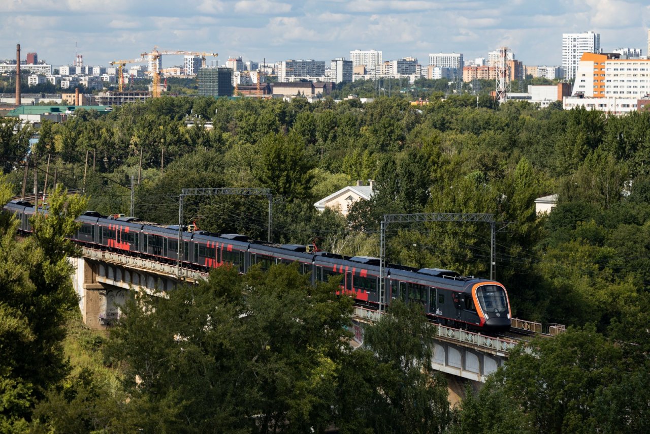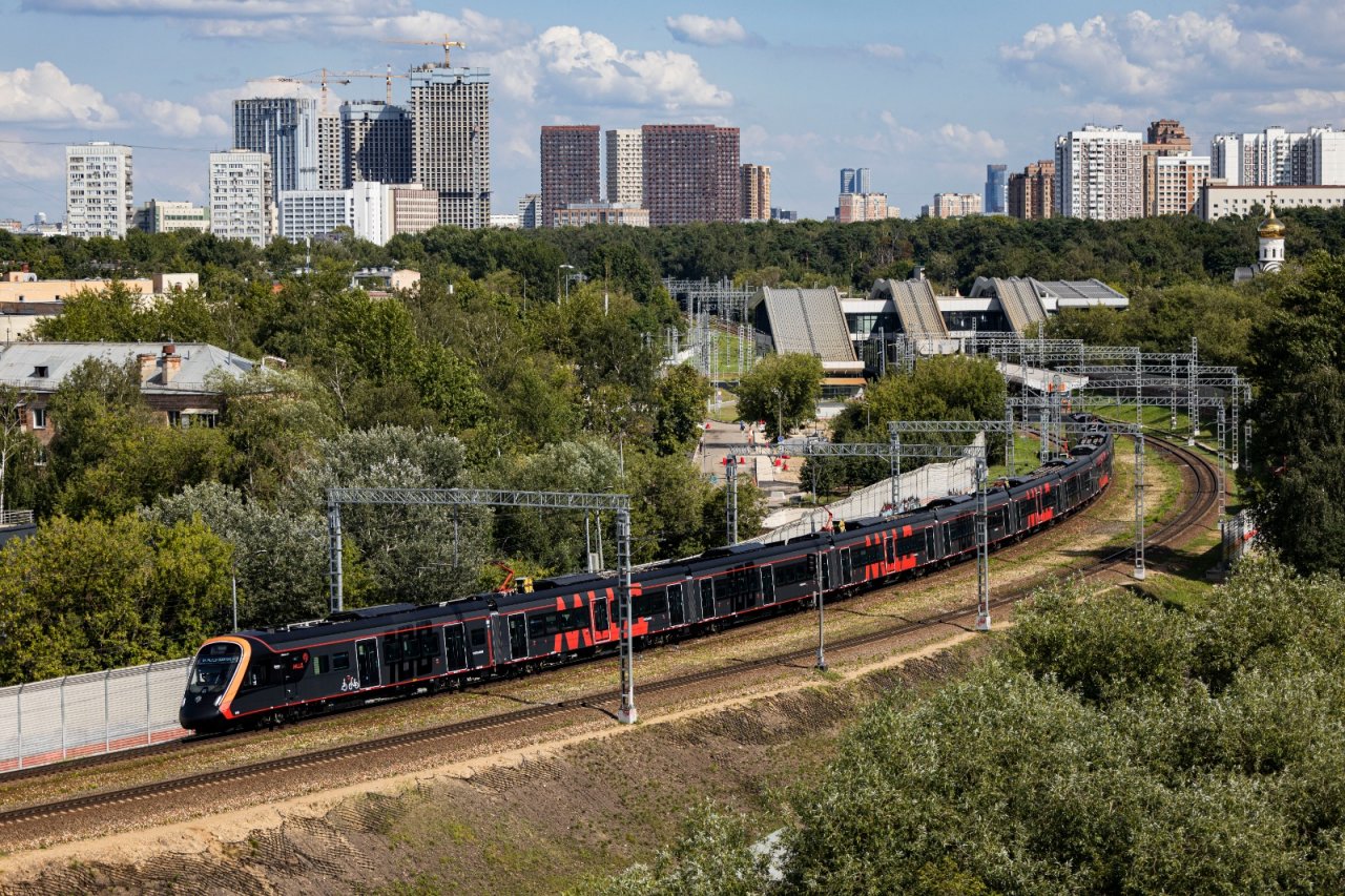 Этот поезд, который вскоре начнет работать на Московских центральных диаметрах (МЦД), получил прозвище «черная молния» из-за стильного матового корпуса, украшенного ярко-красными буквами МЦД и блестящей цифрой 100, символизирующей его статус юбилейного экземпляра.